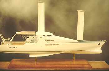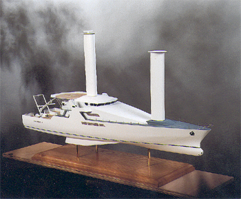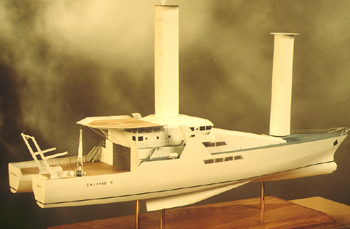 Retenu à l'échelon national suite à un appel d'offre lancé par la Fondation Cousteau (Paris), il m'a été demandé de réaliser pour le musée en cours d'installation sous le parvis du Forum des Halles de Paris, la maquette du navire destiné à l'époque à remplacer Calypso, bâtiment commençant à étre dépassé et trop petit. Ce futur navire reprenait les leçons tirées des essais faits avec le catamaran "Alcyone", celui-ci ayant servi à la mise au point des turbo-voiles. Cette maquette, à l'échelle du 1/75, a été construite selon les plans d'un architecte de marine originaire de Marseille. La coque, traditionnelle dans sa partie avant, se transforme vers l'arrière en coque de catamaran, offrant ainsi dans la zone de travail une surface large et stable, ainsi qu'une mise à l'eau facilitée. La propulsion moteur est assurée par un ensemble Woltz, technique largement utilisée pour les unités demandant une grande manœuvrabilité. |