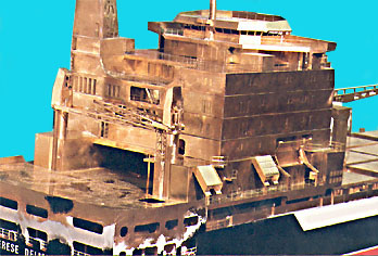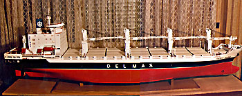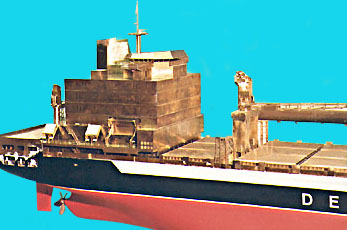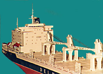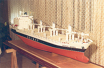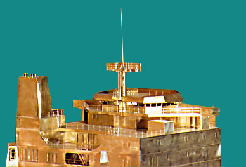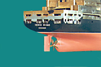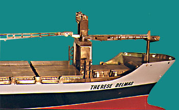 Le directeur du Musée de la Marine de Paris m'avait demandé de lui proposer la maquette d'un porte conteneur moderne, la section "Marine Marchande" du Musée n'ayant que des maquettes de navires relativement anciens. La société Delmas Viljeux venait alors de faire construire une série de 4 porte-conteneurs, dont le Thérèse Delmas, aux Chantiers Navals de Saint Nazaire. Elle a bien voulu me faire parvenir les principaux plans de construction, soit plus de 25kgs de documentation; en complément, une visite du navire, revenant d''un premier voyage d'essais en mer, et amarré au Havre, m'a permis de réaliser plus de 300 photos et d'en comprendre tous les détails. Cette maquette, à l'échelle du 1/100, possède une coque en bois, bordée sur membrure. Le pont, le château, les grues et autres étant quant à eux réalisés en laiton.Les chaloupes ont été faites par dépot électrolytique de cuivre sur un moule en élastomère. Ce navire est exposé au Musée de la Marine de Paris dans la section "navires de commerce". |