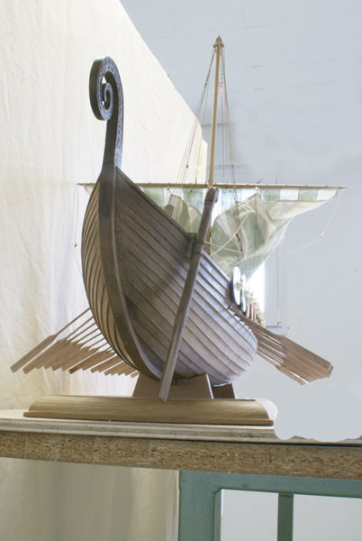 des vikings dans la région. Cette maquette a été réalisée sur la base de quelques plans existants, et à partir d'informations trouvées sur le Net. Cette maquette est construite en poirier, avec un bordage à clins ; c'est à dire que les planches du bordage se recouvrent les unes les autres. Un chevillage, réalisé en noyer, lie les planches entre elles. Ce type de fabrication demande beaucoup de bois, car chaque planche de bordage est faite à partir d'un patron, puis découpé dans la masse. L'ensemble a été monté sur une forme en balsa, les "couples" ayant été rapportés ensuite. Les différents tons ont été obtenus par l'utilisation de teintes chêne de différentes nuances, l'ensemble étant au final ciré. |