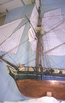 | Le doublage en cuivre a été réalisé par la mise en place de 500 plaques de cuivre de 0,06mm d'épaisseur. Chaque plaque, coupée sur gabarit, est collée puis fixée définitivement par environ 85 clous de 0,4mm de diamètre, la tête des clous étant formée par martelage de la surlongueur de 1mm de fils de cuivre. L'ensemble du doublage a demandé 300 heures de travail. Une fois terminé, le tout a été poncé avec de la laine métallique, et laissé en l'état sans contact pour obtenir une patine naturelle, puis il a été recouvert alors par un vernis protecteur. |