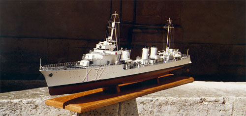| Le directeur du Musée Saint Rémi, à Reims, dans le but de présenter au public différents types de navires dont le point commun est d'avoir été les témoins ou les victimes du sabordage de la flotte de Toulon en 1942, m'a demandé de réaliser à la suite de la maquette du torpilleur le Mameluk le contre-torpilleur le Valmy. Cette maquette est exposée au public au Musée de la Salle de Reddition, à côté du Lycée Roosevelt, à Reims. Malheureusement hospitalisé lors du départ du Valmy, ce modèle est parti rejoindre le Mameluk, je n'ai pu réaliser des photos de détail, mais vous pouvez vous rapprocher des photos du Mameluk, la construction étant du même type. |