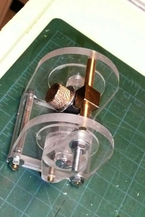 Le toupin, ici à l'envers, équipé de ses 3 bras, dont l'un va servir au guidage. |