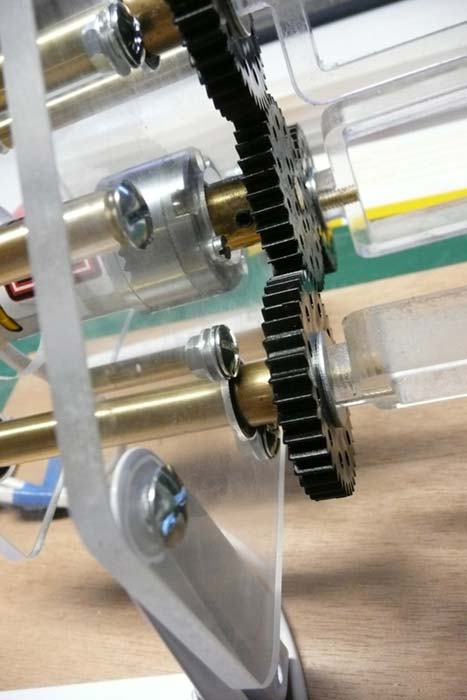 Détail du jeu de pignons permettant l'entrainement des 3 axes à partir du moto-réducteur que l'on aperçoit en partie centrale. |