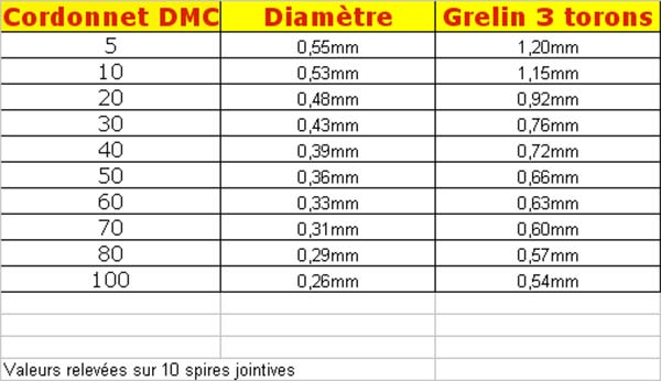 tableau de correspondance entre les numéros de cordonnet, le diamètre