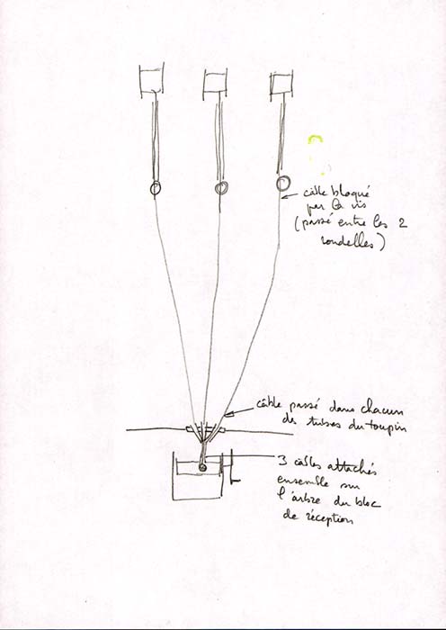des canettes. Chaque fil passe à l'intérieur d'un arbre creux, puis à travers les tubes d'un "toupin" (accessoire permettant de présenter ensemble les 3 fils à commettre). Pour éviter toute rotation de cet accessoire, le toupin est équipé de 3 bras (pour que cette pièce soit équilibrée), dont un va prendre appui sur un guide vertical, sur toute la hauteur du déplacement (une simple ficelle tendue). Les 3 fils sont attachés sur un bloc récepteur, qui va servir de magasin pour le câble réalisé. |