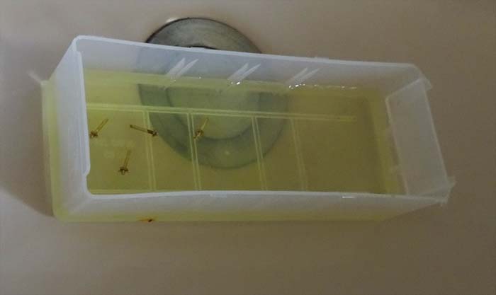 Les pièces sont ici en cours de dérochage dans le bac en plastique. |
