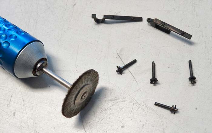 Les parties visibles sont passées à la brossette circulaire. Le laiton noirci brille. Ici, en photo avec d'autres pièces en attente d'être posées. Pour