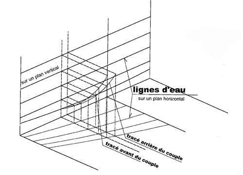 la quille, toutes à la même distance les unes des autres. Chaque courbe de la vue de dessus correspond aux dessins obtenus en plongeant successivement notre petit bateau à toutes les profondeurs correspondant aux différentes lignes horizontales. |