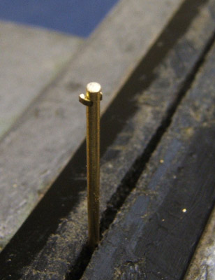 de la cheville. En variante, de vraies rondelles peuvent être débitées. Le trou dans le bordage sera du diamètre de la cheville ; la rondelle sera trouvera prise entre le bordage et la goupille roulée. |