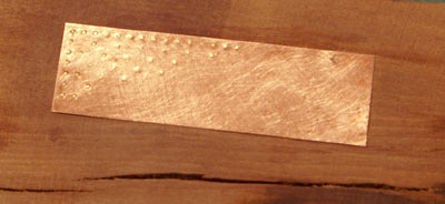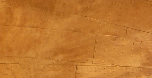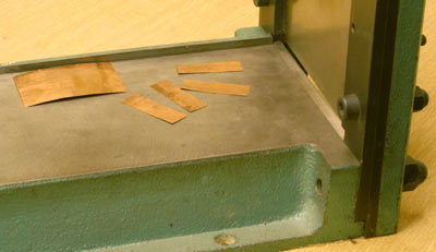 Cisaillage de plaques de cuivre ; une surlongueur est laissée, afin de permettre un ajustement entre 2 plaques d'une même "bande". En effet, ces bandes ne sont forcement rectilignes, et peuvent présenter un "angle"sur leur longueur, ou un certain angle sur le petit côté, du fait même des courbures de la coque. |