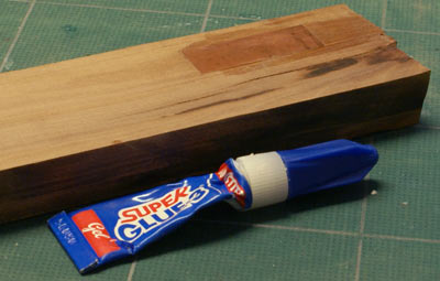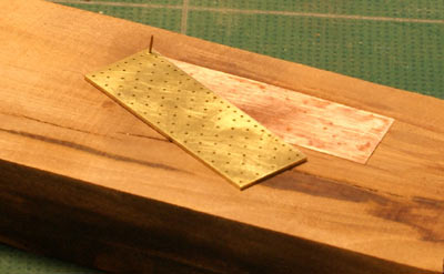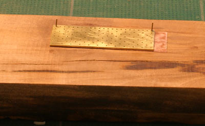 La démonstration est faite ici sur un bloc de poirier. En réalité, le perçage de la plaque de cuivre et du bois à travers le gabarit se fait directement sur la coque. Chaque