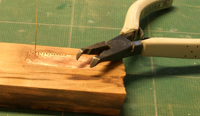 Mise en place à l'aide d'une pince "adaptée", du fil dans chacun des trous, coupé en laissant dépasser le fil de 0,5mm environ |