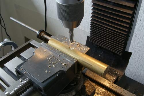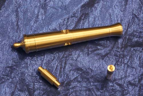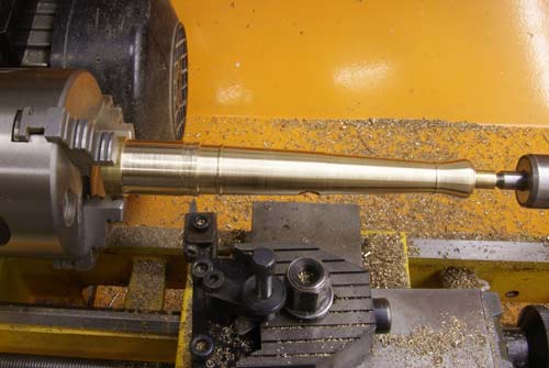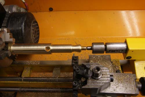 Les 2 éléments du canon. Le diamètre de l'embase du tourillon est obtenu en fonction du diamètre exact du perçage. (La petite pièce en bas à droite est le support ayant servi à maintenir le canon sur la contre-pointe) . |