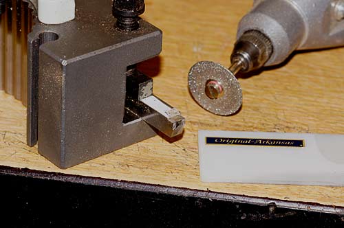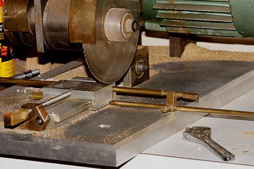 | Les opérations commencent par le tronçonnage du rond de 6, sur une machine de ma fabrication, avec une surlongueur de 20 mm. (Elle me sert, en plus du tronçonnage jusqu'au Ø 20 à la réalisation de profilés en laiton l'aide de guides se montant sur la partie droite de l'étau, et montage de fraises-scie diverses ; ici une fraise de Ø 125 ép 0,8 mm ). |