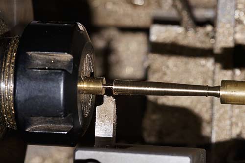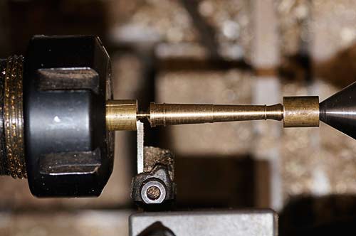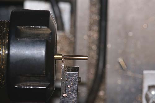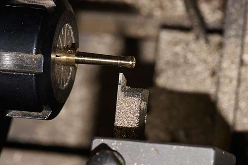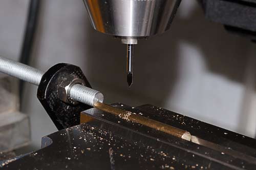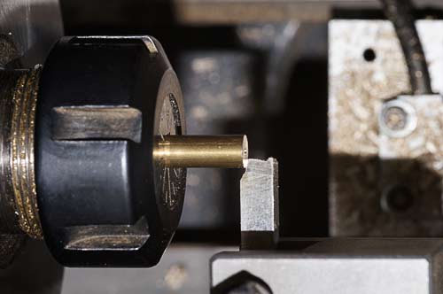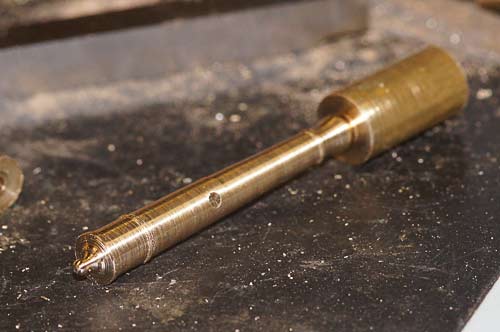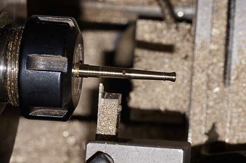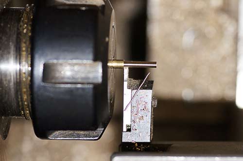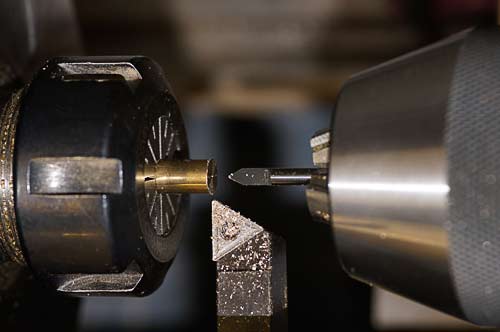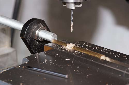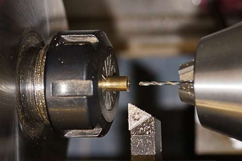 Avant perçage de l'âme du canon, le centre est pointé à l'aide d'une fraise à graver ; c'est beaucoup plus précis qu'avec un foret à centrer. |