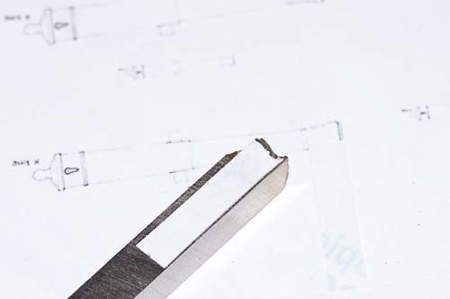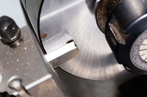 L'opération de tronçonnage se fait à l'aide d'une lame de 1,4 mm, avec affûtage à droite en arc de cercle, à gauche un pan coupé à 45° pour une répartition des efforts (et éviter une flexion de la lame). |